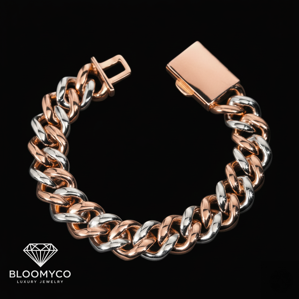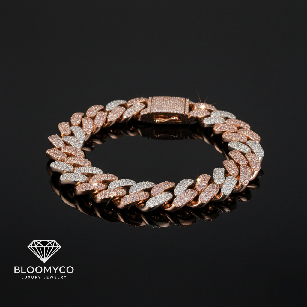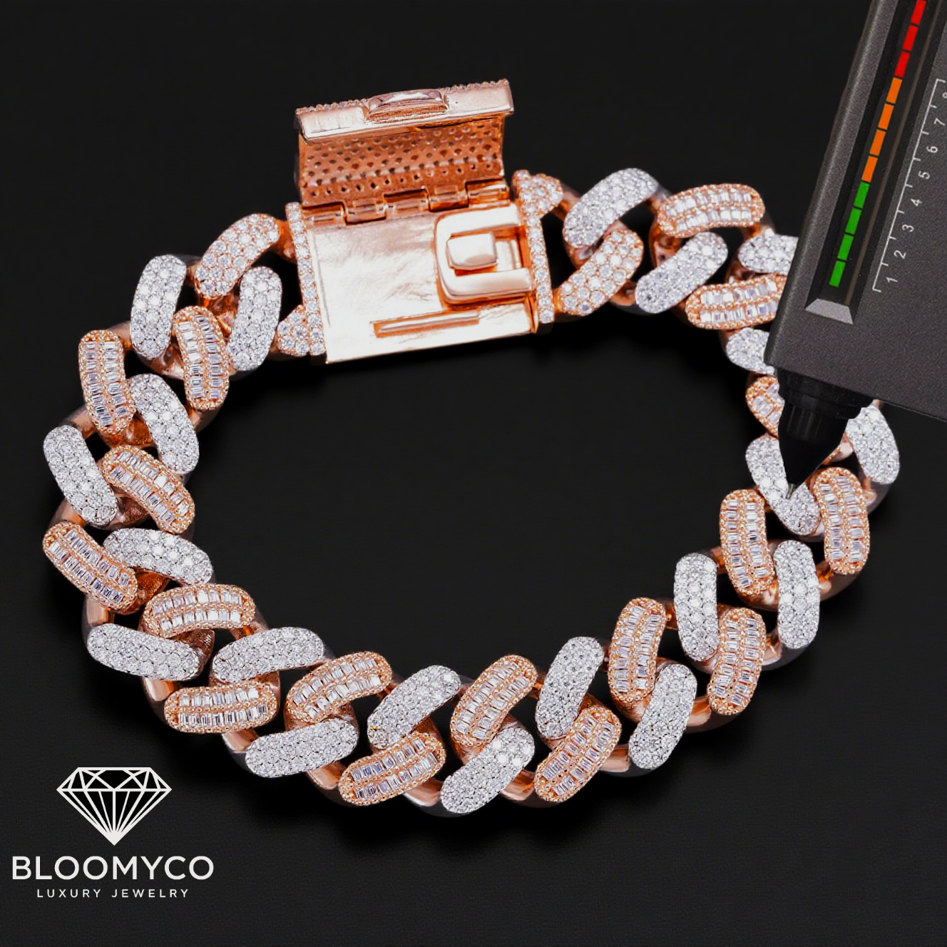 Level up your wrist game with this 16MM heavyweight two-tone Cuban bracelet, flooded with hand-set moissanite for insane shine. Each link alternates between silver and rose tones, giving it that luxury designer look that instantly stands out. This piece hits hard in person — thick, bright, and built to flex.