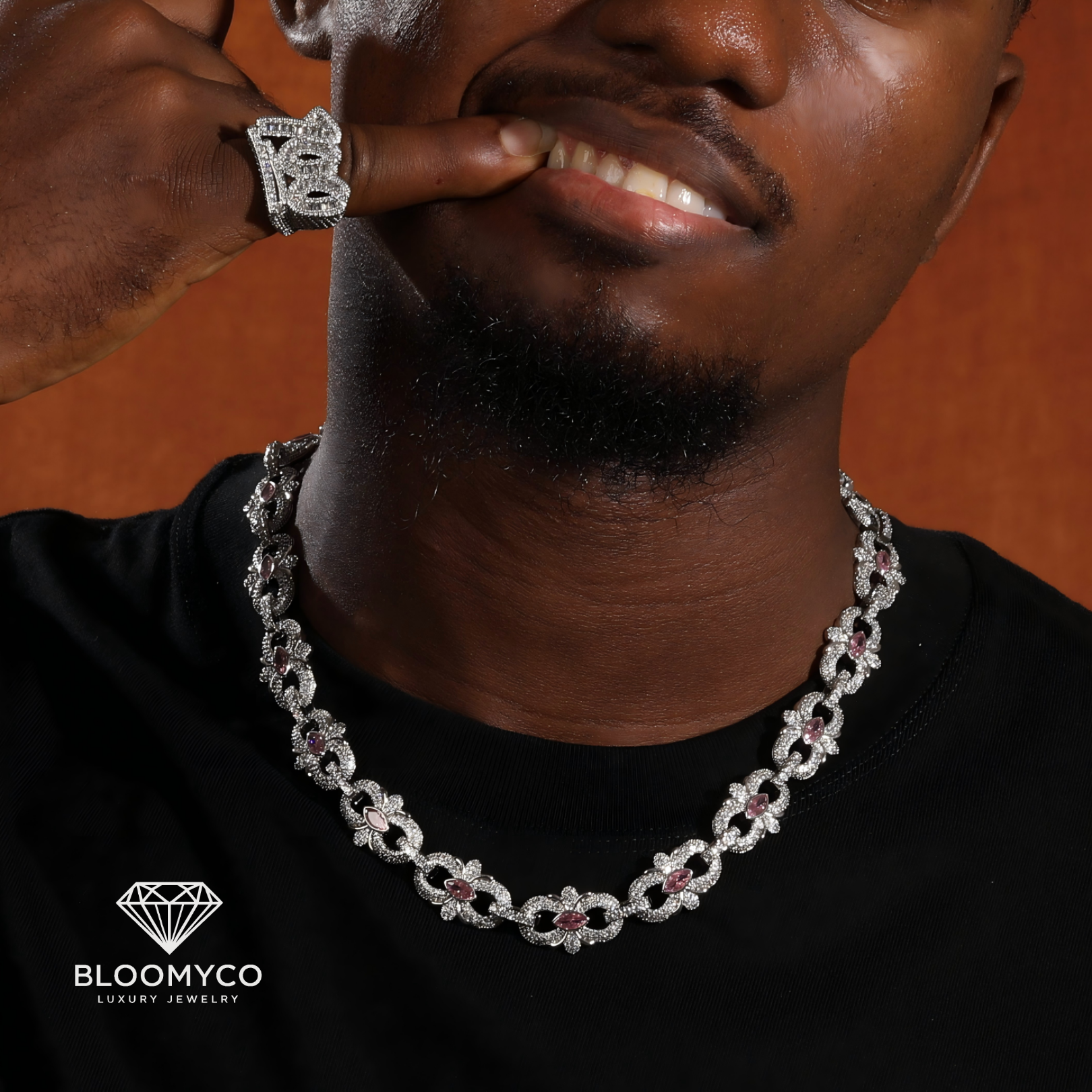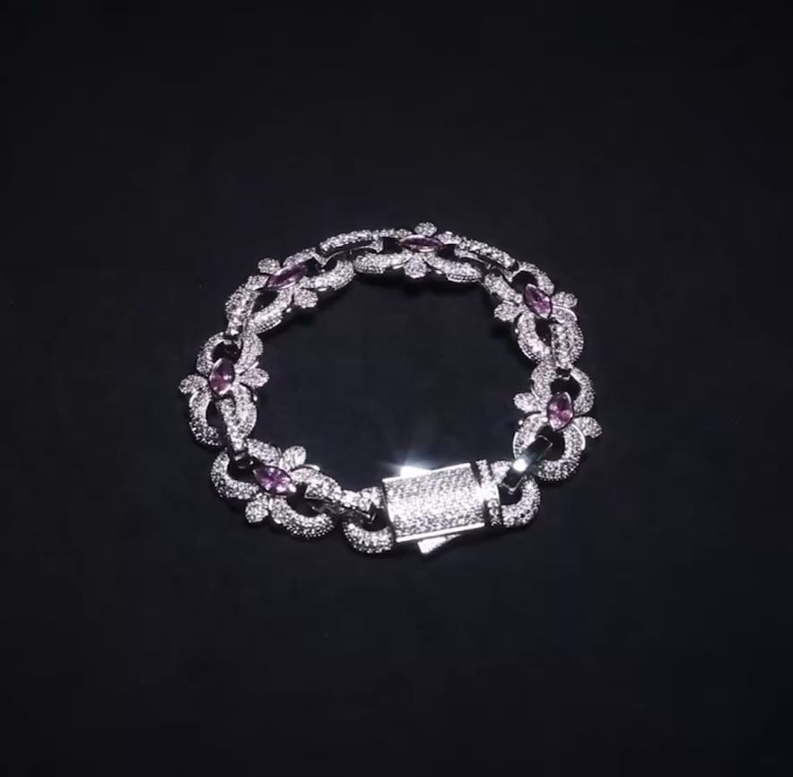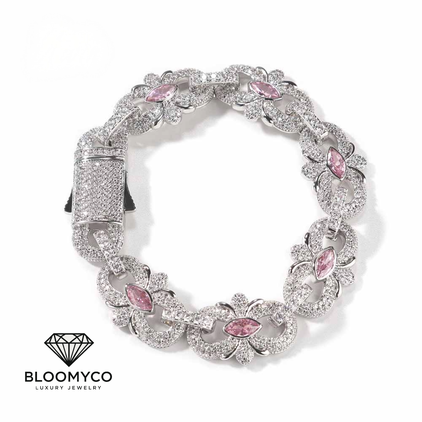 This stunning bracelet features an intricate flower-inspired link design, fully iced out with premium Cubic Zirconia stones for a brilliant shine. The centerpiece marquise-cut CZ accents add a touch of luxury and color, available in multiple options like pink, blue, or red.