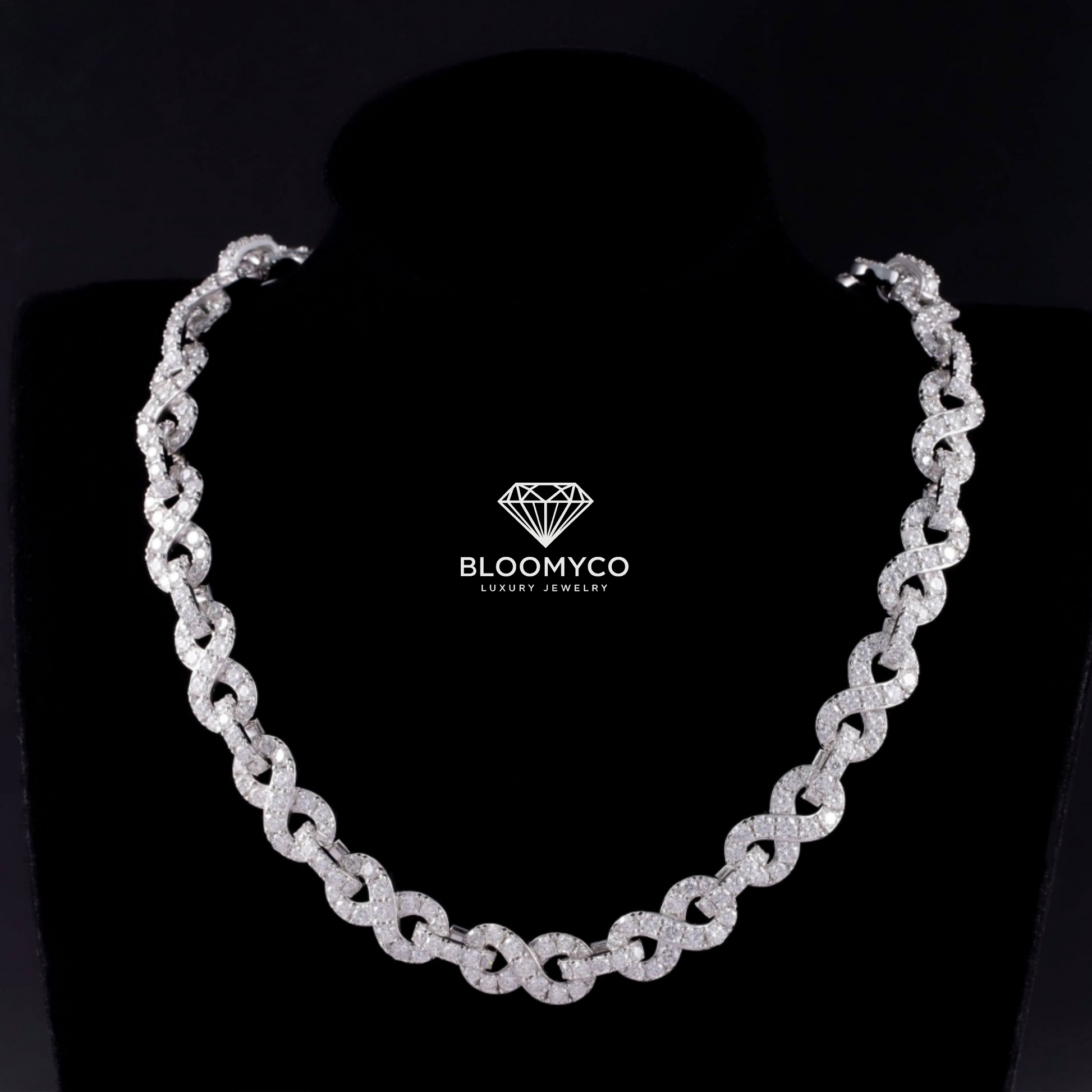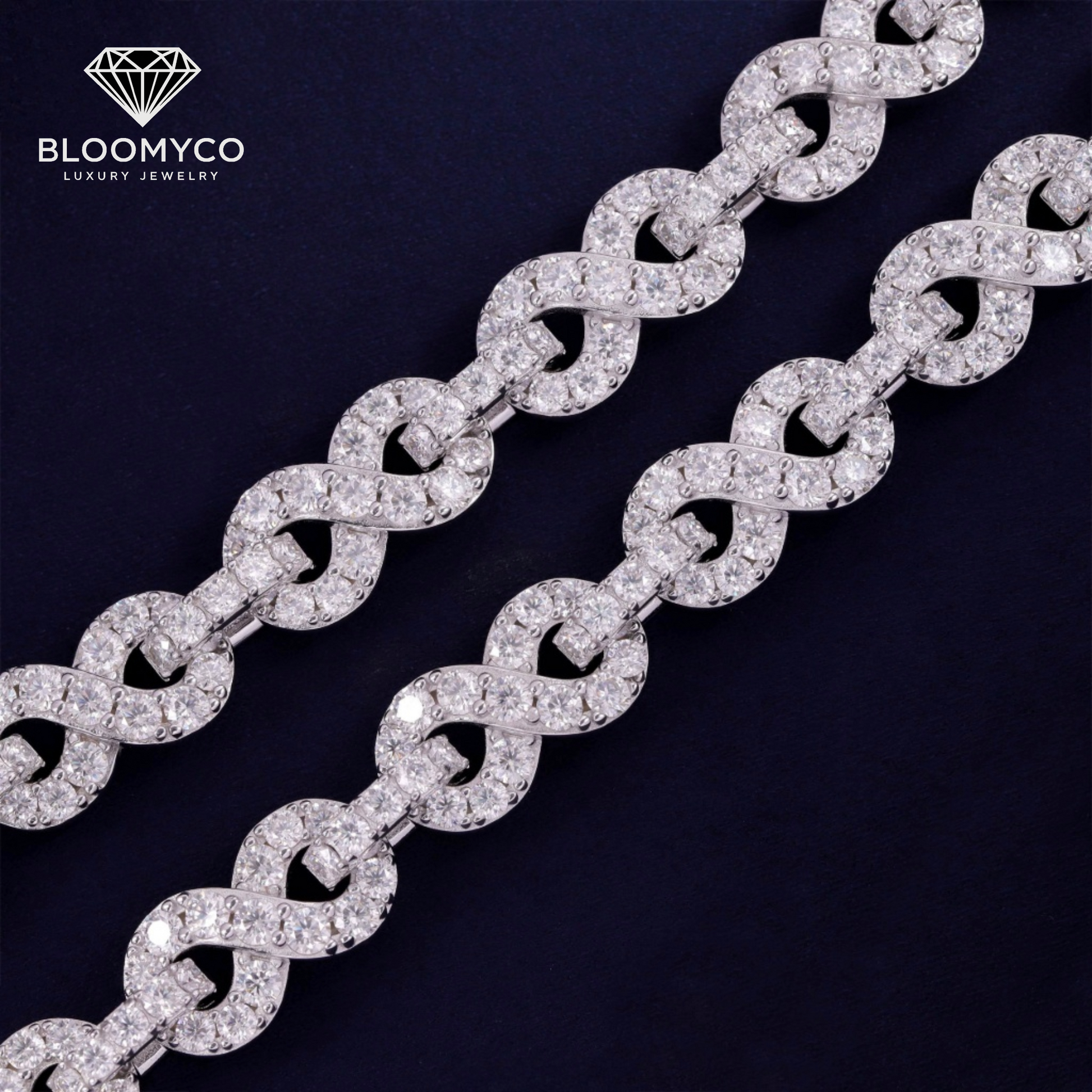 Complete your look with BloomyCo’s Infinity Cuban Link Bracelet, a sleek evolution of the classic Cuban design. Crafted from solid 925 sterling silver and plated in white gold, each link features hand-set VVS Moissanite diamonds that deliver unmatched brilliance and fire.